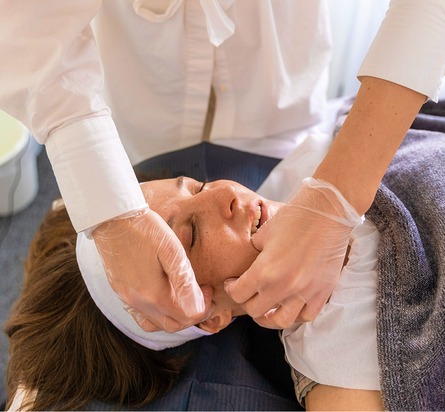 Gloved internal movements target deep muscle tension, releasing tightness in the jaw, cheeks, and lower facial fascia.